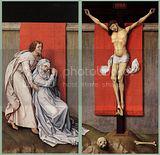 Considering the violence of the inspiration, making this a triptych work was a very interesting choice. A triptych is basically a form of composition where three very closely related paintings would be together in a sequence, and this form was historically reserved for religious alters showing devotional or strictly Christian imagery. However, even though the furies are not a Christian thing at all, this work has a Christian influence to it but one that has been twisted. The radiant red background alludes to the red in background of many depictions of the crucifixion, like for example in the Flemish Renaissance painter Rogier Van der Weyden: The effect is almost to suggest that the crucifixion of Christ, what was to set mankind free of its sins, has either failed or become distorted on some fundamental level. Bacon also admitted a fascination with meat and the butchers' shop, having spoken about how hanging carcasses looking like the image of the crucified Christ. As can be seen above, the Furies from the Greek legend do look like slabs of some kind of strange animal hanging in a butchers' shop.